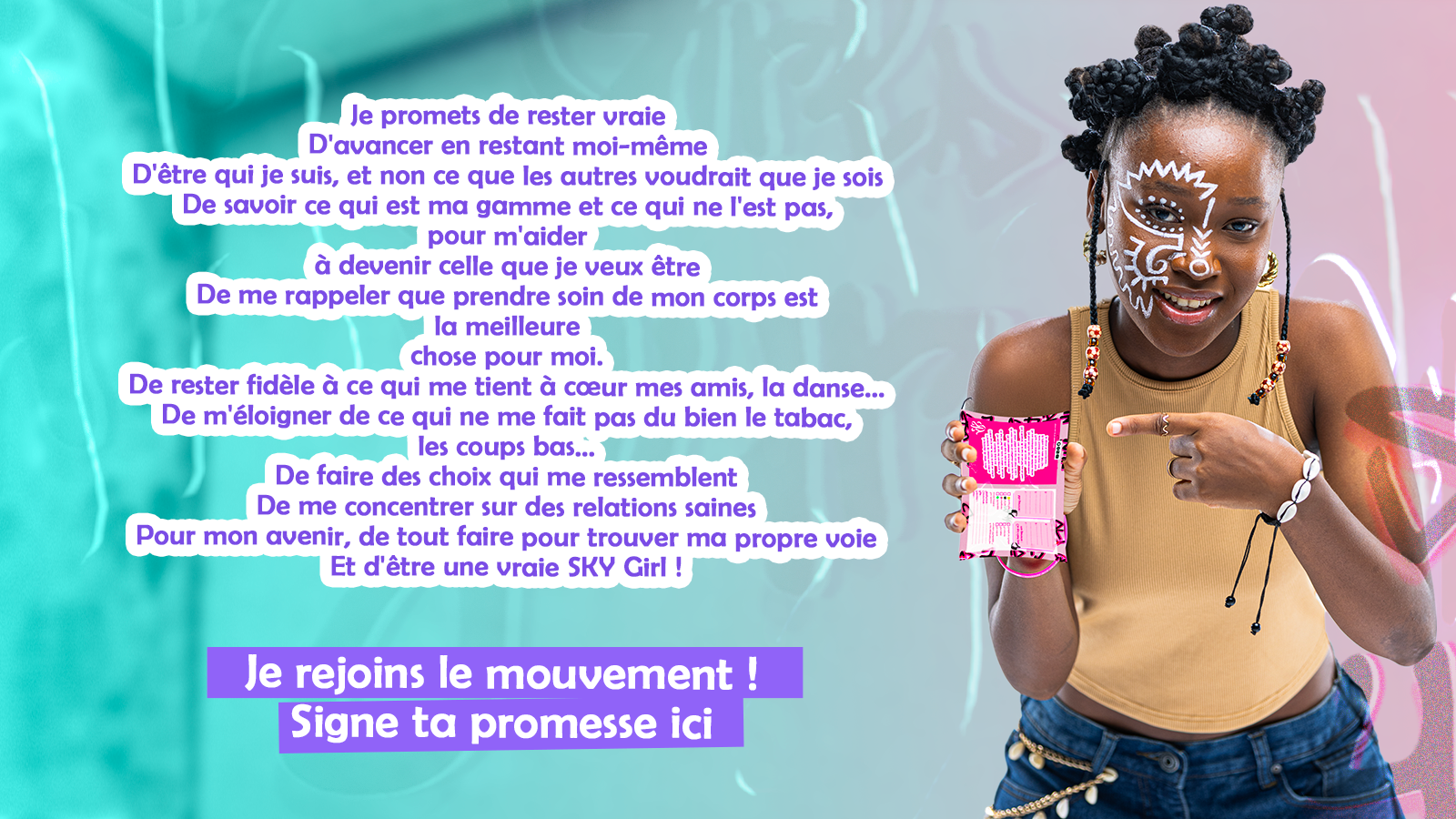 SKY soutient les filles qui s'efforcent à rester elles-mêmes et à faire des choix sur des choses qui comptent vraiment pour elles. L'un de ces choix est d’avoir plus confiance en elles, car c’est un désir que les jeunes filles ont partagé avec nous, mais qui peut être difficile pour certaines. Le mouvement est présenté aux filles par un groupe de personnes et d'organisations qui croient en elles et en leur avenir.